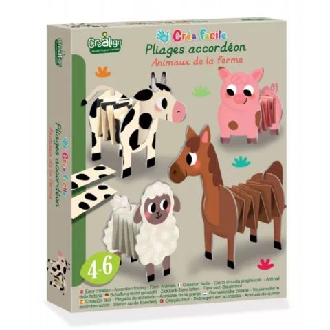 Jedinečná kreatívna súprava obsahuje 4 zvieratká z farmy na zostavenie a 8 papierových pásov na vytvorenie harmoník - telíček zvieratiek. Deti si zostavia figúrky zvieratiek, vytvoria im telíčka podľa návodu a po dokončení si ich vystavia ako dekoráciu alebo sa s nimi môžu hrať. Tvary dokonale zapadnú do seba, nožnice ani lepidlo nie sú potrebné. Tvorenie z papiera podporuje rozvoj jemnej motoriky, predstavivosti aj kreativity a trpezlivosti.