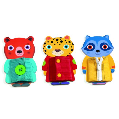 Tri veselé zvieratká majú na sebe oblečenie s rôznym typom zapínania. Deti si tam môžu vyskúšať zapínanie na gombík, zips alebo nity. Pri hre trénujú svoju trpezlivosť, rozvíjajú predstavivosť a najmä zdokonaľujú jemnú motoriku.