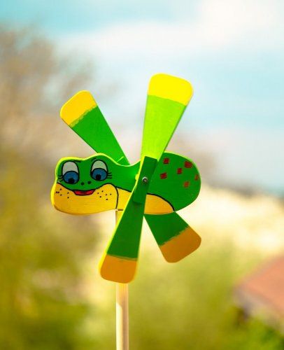 Roztomilá drevená ručne maľovaná vrtuľka v tvare žabky bude ozdobou každej záhradky, terasy alebo balkóna. Aký silný vietor práve fúka deti zistia podľa toho, ako rýchlo sa budú krídelká na vrtuľke točiť. Vďaka dlhej palici sa vrtuľka dá ľahko zapichnúť do zeme. Vrtuľky sú vyrábané a maľované ručne - konkrétne dostupné farebné prevedenie sa môže líšiť od vyobrazenia. Vrtuľka je odolná voči dažďu, ale pre zachovanie dlhšej životnosti, odporúčame pred osadením prestriekať bezfarebným lakom. V cene je aj drevená palica na zapichnutie. Nie je to hračka, ale dekorácia.