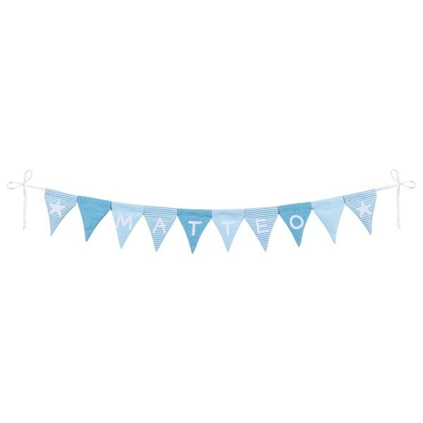 Táto girlanda je veľmi osobný darček na každú príležitosť, nakoľko si vďaka priloženým písmenkám viete vytvoriť vlastný dizajn so želaným menom. Desať látkových vlajok (10 x 7 cm) so 4 hárkami s nalepovacími písmenkami a znakmi môžete rôzne kombinovať a vytvoriť dekoráciu na narodeninovú oslavu, prvý deň v škole či ako výzdobu detskej izby.