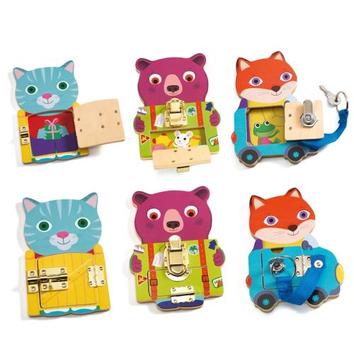Každé veselé zvieratko má na dverách s pántom inú zámku: závoru, zámku na kľúčik a západku. Keď deti pomôžu mačke, líške a medveďovi otvoriť zámku, zistia čo sa skrýva za vrátkami, za dverami auta a v kufri. Deti si pri hre trénujú svoju trpezlivosť, rozvíjajú predstavivosť a zdokonaľujú jemnú motoriku.