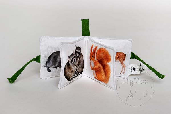 Malé textilné leporelo s obrázkami lesných zvieratiek je určené najmenším deťom. Knižka obsahuje originálne kresby prenesené na textil. Jedna zo strán obsahuje rolničku, ktorá jemným zvukom upúta pozornosť dieťatka a stimuluje jeho sluch. Okrem hladkých strán leporelo obsahuje úchopové stuhy, ktoré pomáhajú stimulovať hmat a jemnú motoriku.