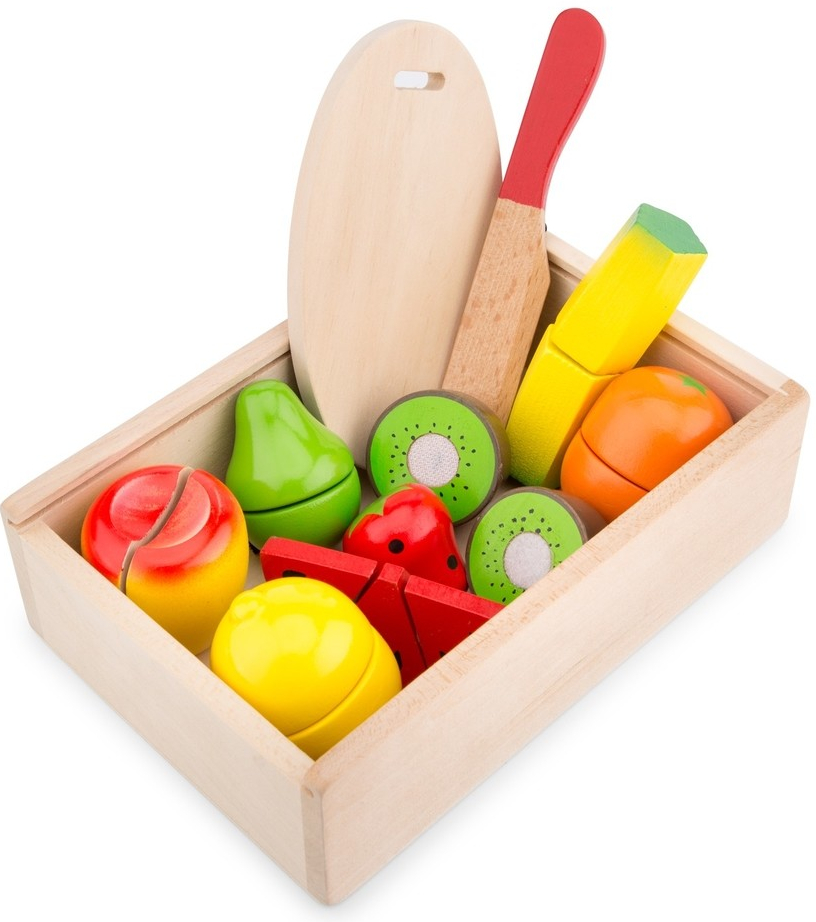 Táto skvelá sada dreveného ovocia na krájanie obsahuje 8 druhov (citrón, pomaranč, hruška, jablko, banán, melón, kiwi, jahoda), nôž a dosku na krájanie. Ovocie sa dá "pokrájať" a opäť spojiť vďaka suchému zipsu, ktorý spája jednotlivé časti. Ovocie je balené v praktickej drevenej krabičke s priehľadným vysúvacím krytom pre lepšie uskladnenie.